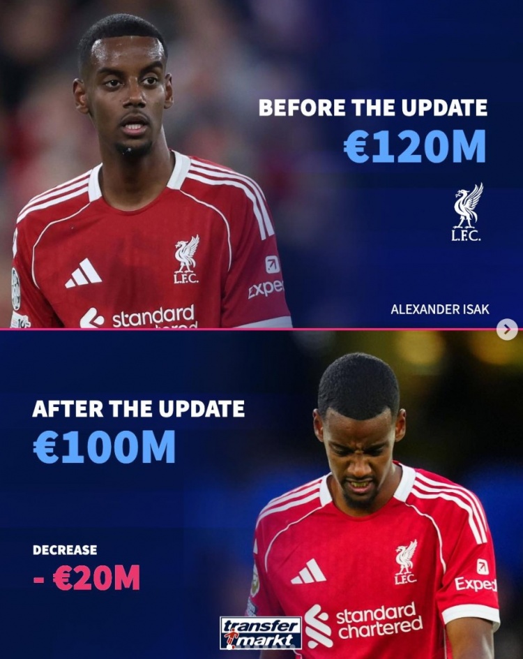 德转更新后列身价下跌球星:伊萨克、贝林领衔 萨卡、巴斯托尼在列