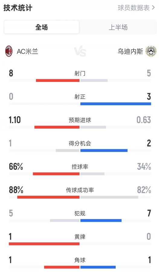 米兰半场0-2乌迪内斯数据:射门8-5,射正0-3,控球率66%-34%